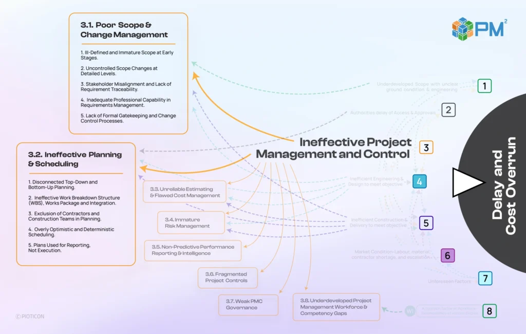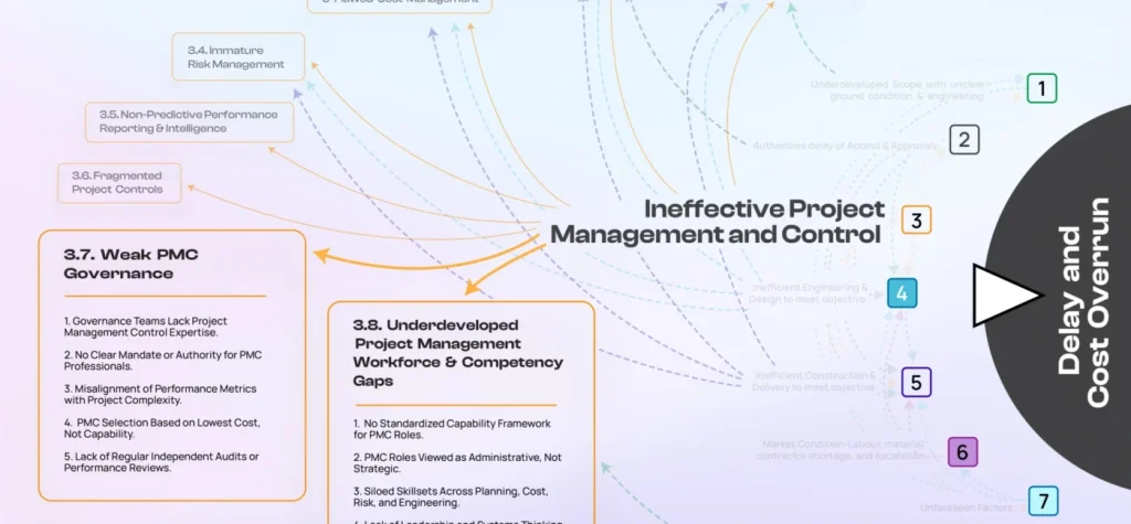 Beyond PMC, delays in Access & Approvals, frequent Scope Changes, or inefficiencies in Design & Construction all ripple into PMC processes. At the same time, weak PMC disciplines amplify failures across these clusters.